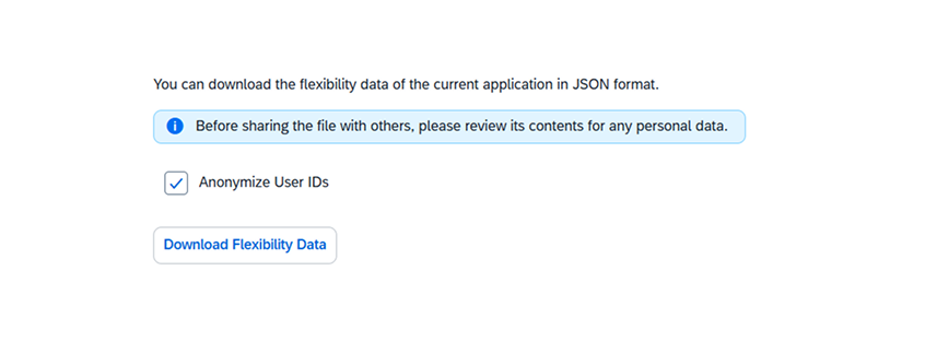 When you press this button, a JSON file downloads to your machine. It contains the flexibility data from the current application. You can examine this data or send it to support for troubleshooting. Make sure to review the file contents for any personal or confidential data before sharing..